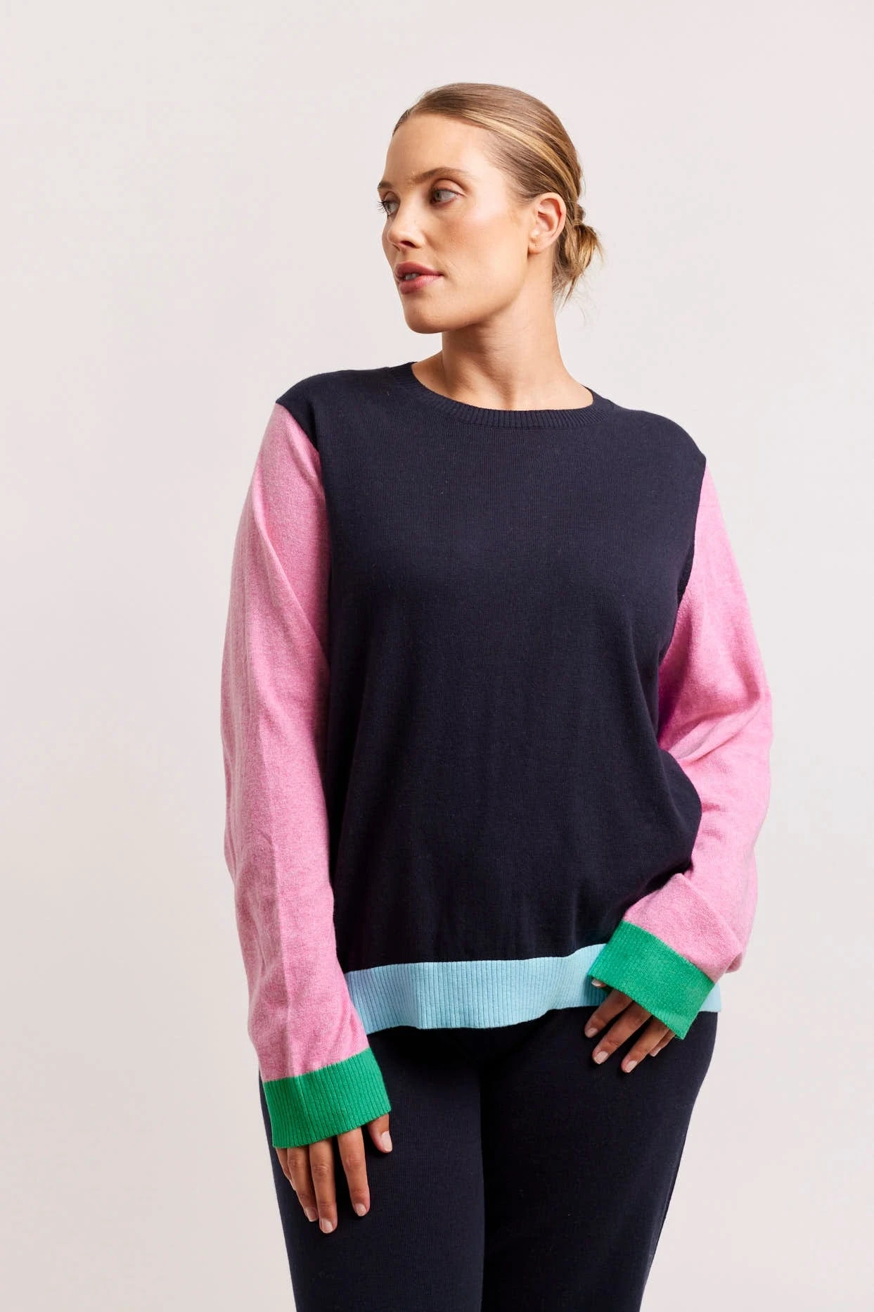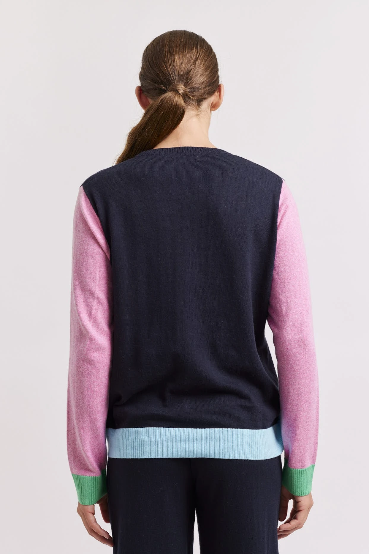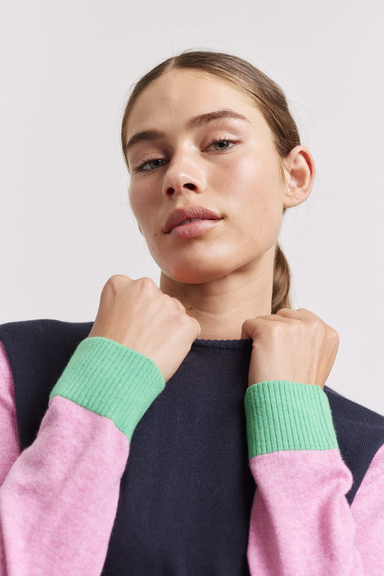 - Pink lady sleeves, pine green cuff & surf blue hem