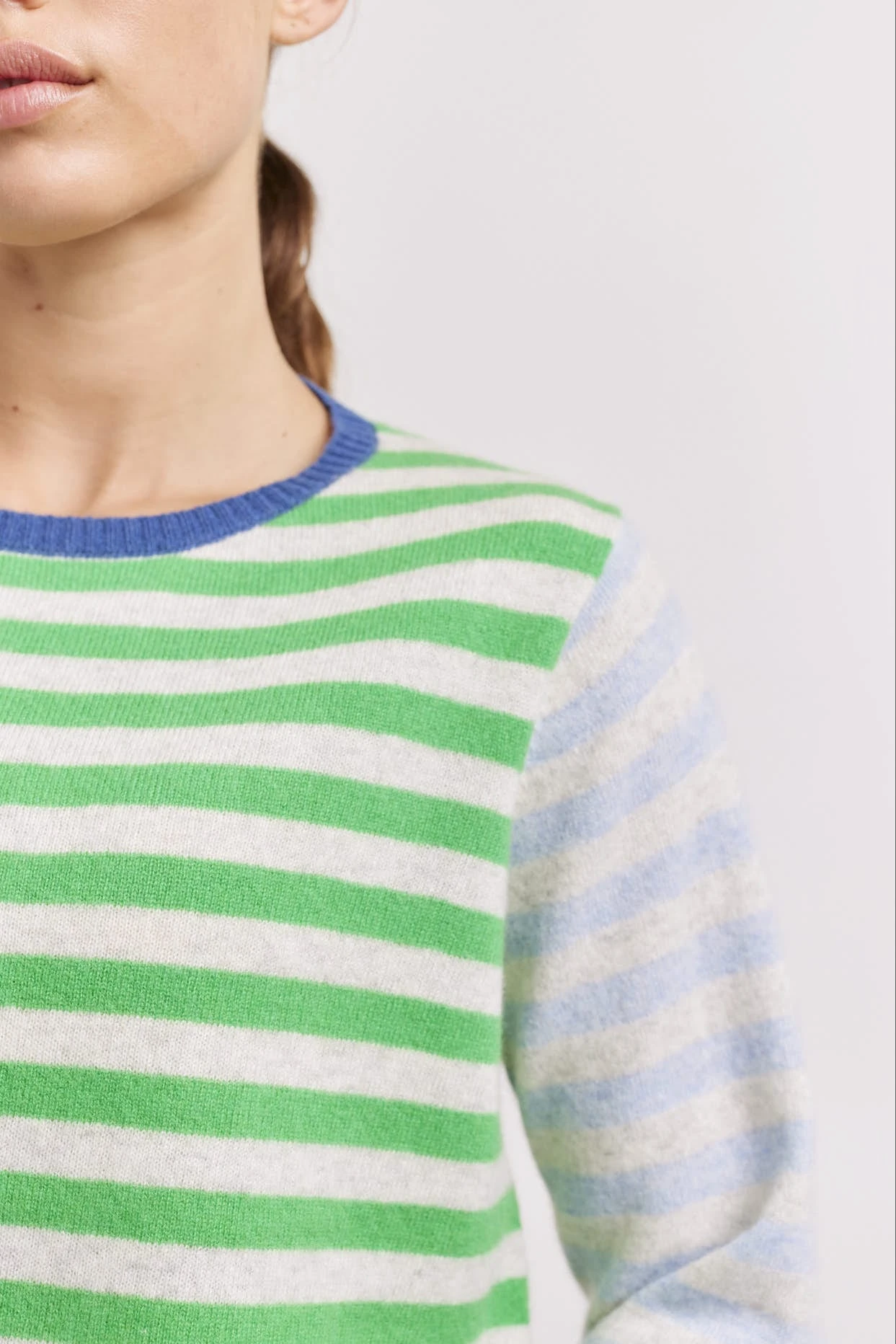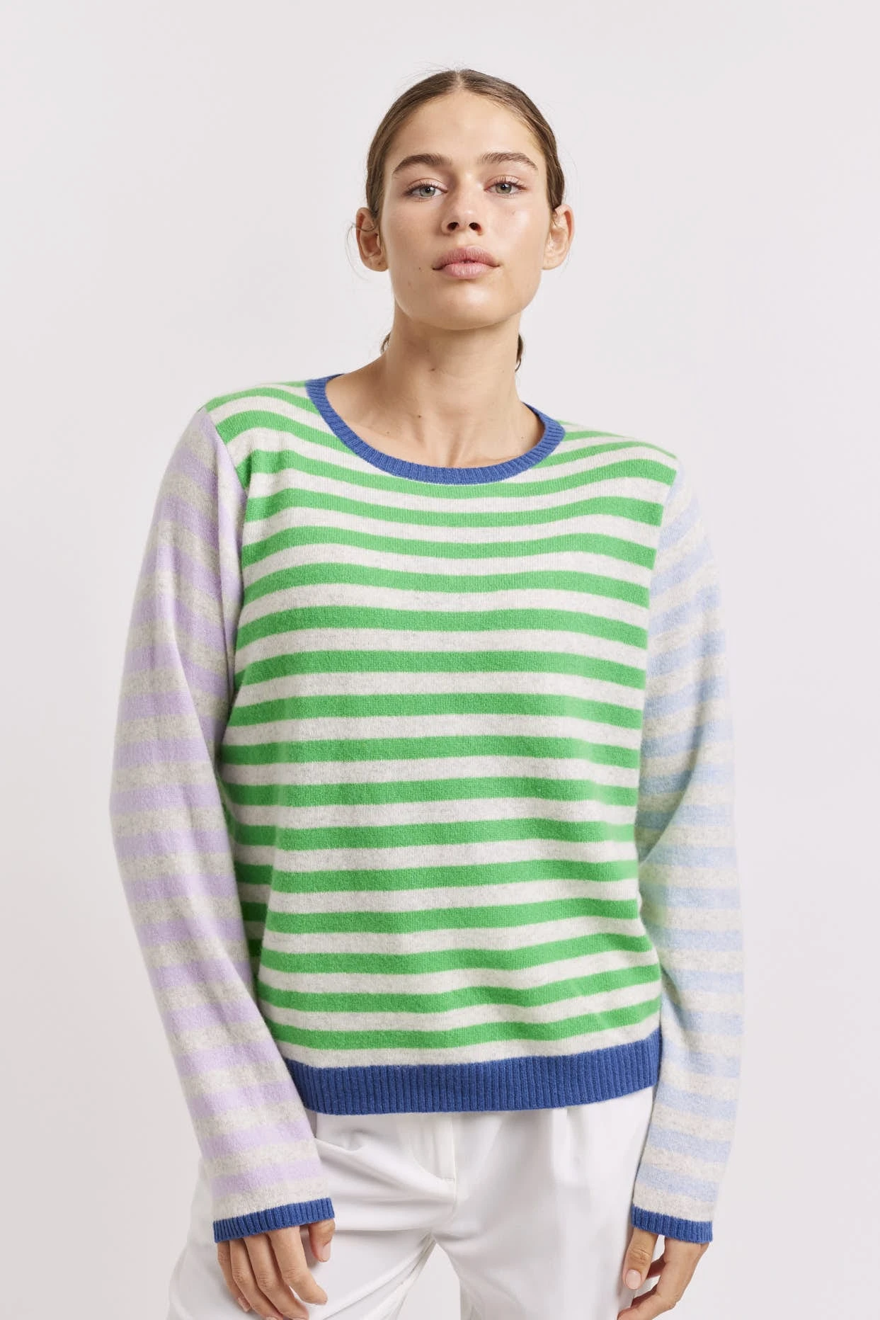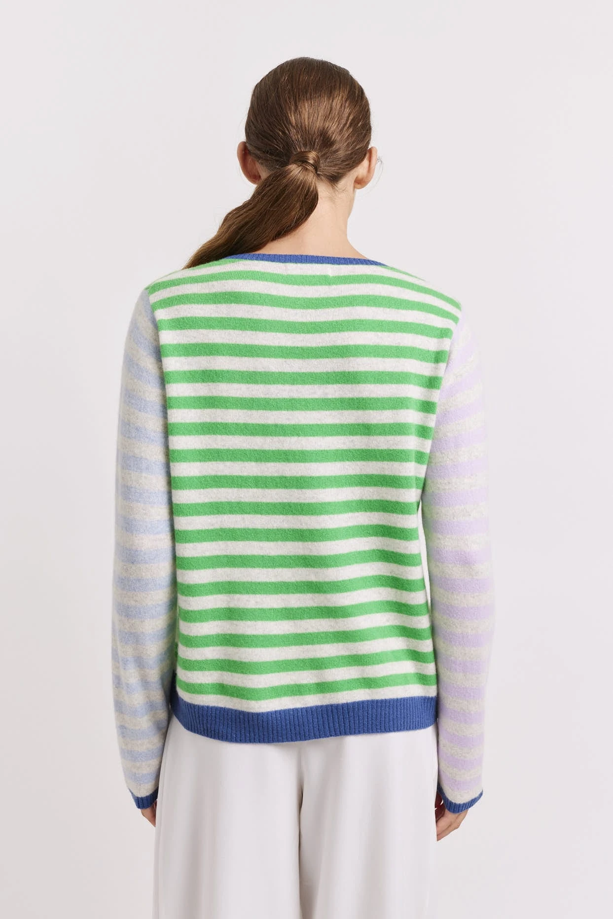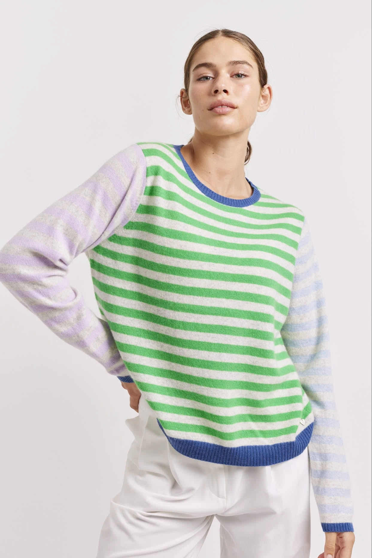 - Contrast water blue & haze lilac stripe sleeves