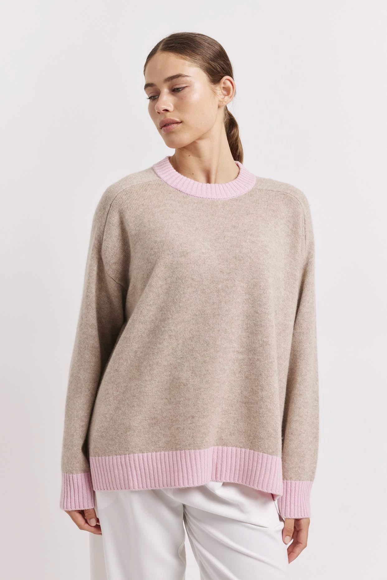 - Contrast blossom pink hem, neck & cuff