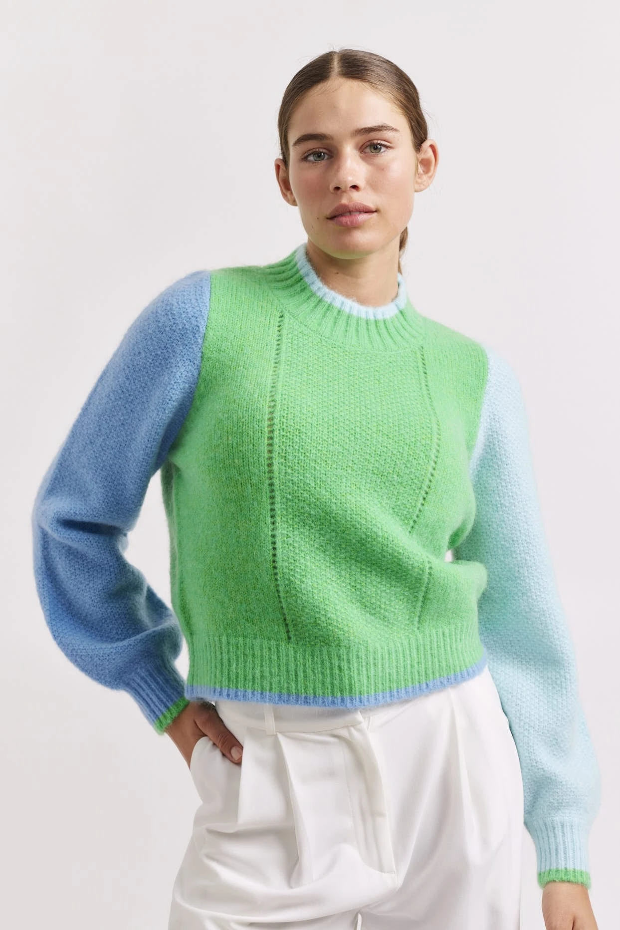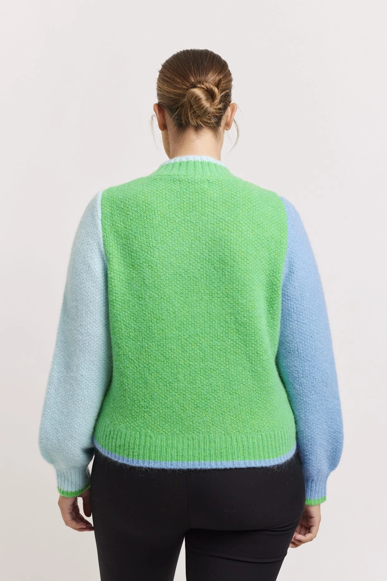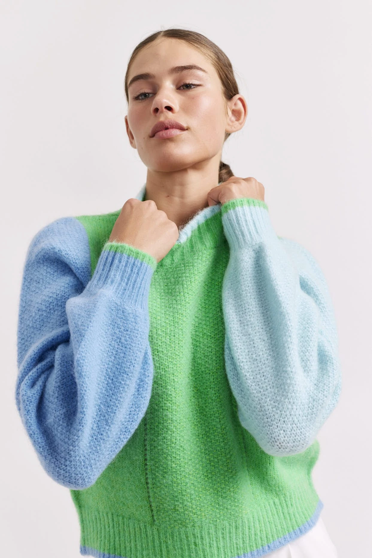 - Apple green body with contrast cornflower blue & aqua sleeves